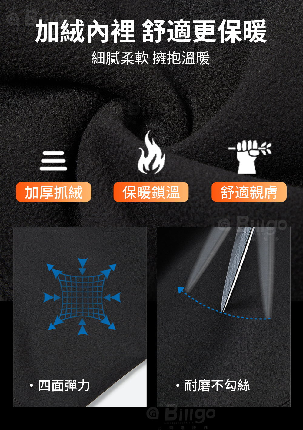 ●布料特色:四向彈力|防潑水|保暖刷毛|耐磨抗刮